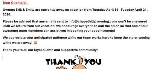 4. Clients are required to call/email Chapel Hill Grooming Studio within 24 HRS if there is anything that needs to be fixed after their grooming appointment; this policy applies to full groom services, bath + brush services or a la carte/walk in services. After 24 HRS, regular pricing fee will be applied.